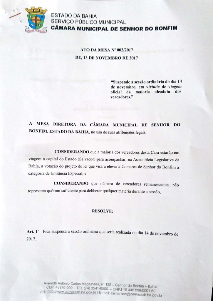 Em virtude de viagem oficial da maioria absoluta dos vereadores à capital baiana, o presidente da Câmara de vereadores de senhor do Bonfim, Reinaldo Santana, resolveu suspender a sessão desta terça-feira (14)